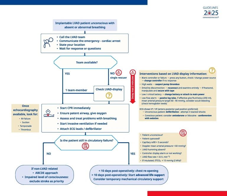 Los dispositivos de apoyo circulatorio mecánico, especialmente los dispositivos de asistencia ventricular izquierda (LVAD) se están utilizando cada vez más como un puente hacia el trasplante de corazón o la recuperación en pacientes con insuficiencia cardíaca avanzada. Los pacientes con estos dispositivos a menudo carecen de signos clínicos tradicionales, como un pulso, incluso cuando hemodinámicamente estable y, por lo tanto, la evaluación del estado circulatorio mediante palpación, medición no invasiva de la presión arterial y oximetría de pulso puede ser difícil. El reconocimiento de paro cardíaco se basa en la ausencia de capacidad de respuesta y respiración. Cuando se realiza, se recomienda la RCP convencional. El riesgo de desplazamiento del dispositivo durante la RCP parece mínimo.425,426Las recomendaciones del ERC se basan en el ILCOR 2025 CoSTR y las directrices de las Sociedades Británicas 2025425,426sobre la gestión de emergencias en receptores de LVAD implantables en centros de trasplantes (Fig. 18).•Activación inmediata de equipos especializados para pacientes inconscientes con LVAD.•Inicie la RCP mientras intenta restaurar el dispositivo si hay varios rescatistas disponibles. Considere retrasar la RCP hasta 2 minutos para intentar restaurar el dispositivo si hay un solo rescatista presente.•Solucionar problemas del dispositivo como prioridad, siguiendo los protocolos pertinentes:OAlarmas de bajo flujo: Compruebe la capacidad de respuesta del volumen con la técnica de elevación de piernas. Si la alarma se resuelve y se confirma la hipovolemia, proceda con la reanimación con líquidos. Compruebe los valores de hemoglobina lo antes posible para evaluar el contexto de la hipovolemia, hemorragia o deshidratación. En casos de bajo flujo resultante de presión arterial alta, maneje la carga posterior con antihipertensivos.O Trombosis de la bomba: administre la anticoagulación o considere el soporte circulatorio mecánico como la ECMO.O Fallo eléctrico: Asegúrese de que la conexión a una fuente de alimentación y la integridad de las líneas eléctricas. Reemplaza las baterías o el controlador.O Arritmias: Se debe realizar desfibrilación o cardioversión si es necesario, asegurando una sedación adecuada si el paciente aún está consciente. Un LVAD funcional puede proporcionar suficiente perfusión cerebral incluso en corazones fibrilados.•Simultáneamente (si hay un segundo socorrista disponible) dirire las vías respiratorias, la respiración, el corazón (monitor/desfibrilador).•Determinar la adecuación de la circulación. Evalúe al paciente por MAP > 60 mmHg, ausencia de cianosis y presencia de un zumbido audible de LVAD. Es posible que se requieran ecocardiografía y monitoreo invasivo para una evaluación precisa. En casos de circulación inadecuada, considere el apoyo mecánico temporal o la cirugía correctiva. Si el dispositivo:OEstá funcionando bien y el paciente no está en insuficiencia circulatoria: Realice una evaluación ABCDE completa O Todavía no funciona o el paciente tiene insuficiencia circulatoria: Comience la RCP y–Considere la reapertura del pecho si < 10 días desde la implantación–Entregar ALS estándar, abordando 4H y 4 T.