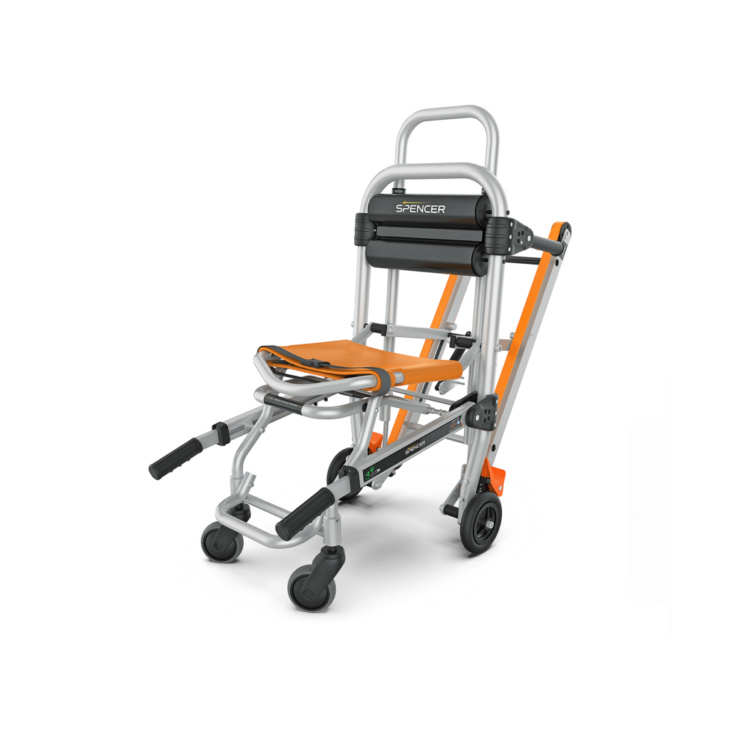 4BELL STAIR+ es una silla de transporte ligera y plegable diseñada para trasladar o evacuar a pacientes con movilidad limitada de edificios de varias plantas. Dos raíles autofrenantes ayudan a descender escaleras de forma segura y controlada. Se fabrica de acuerdo con las especificaciones de la norma EN 1865-4 y cumple la norma EN 1789 cuando se ancla al sistema de anclaje específico 4BELL Stair+ Max.