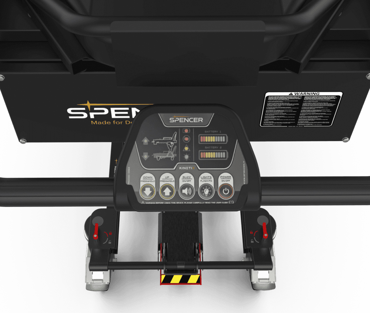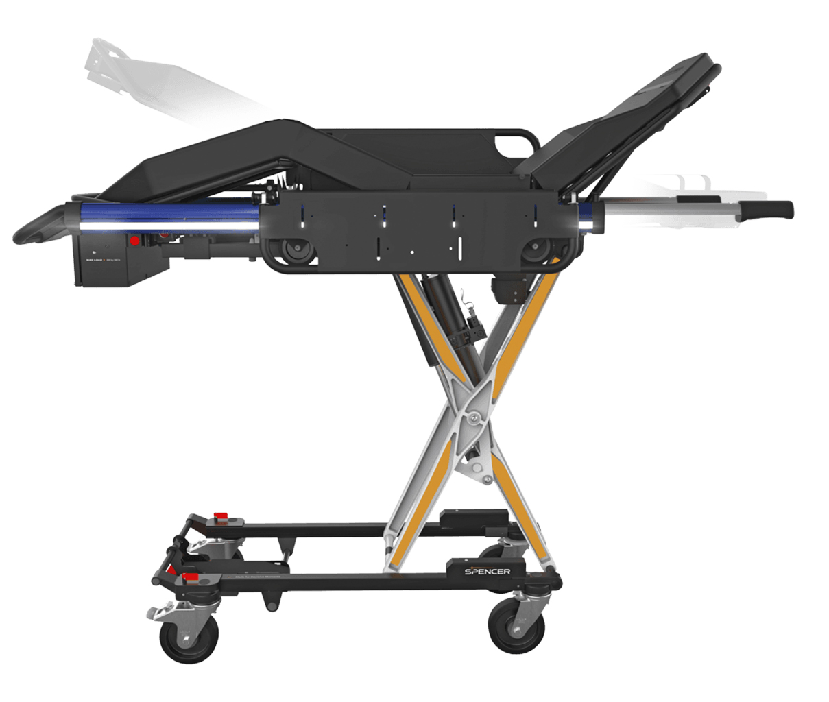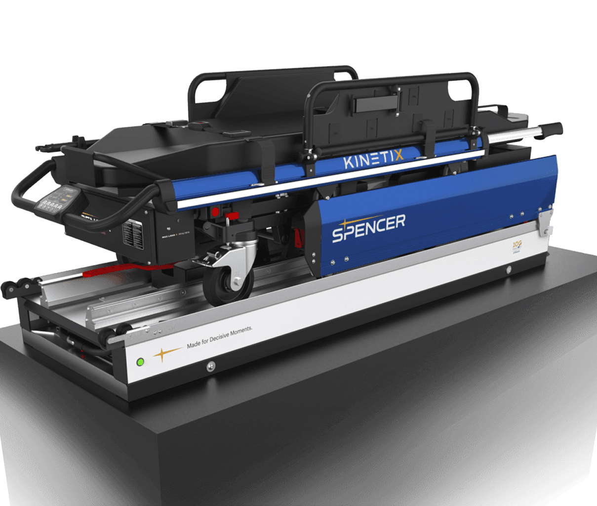 KINETIX es una camilla motorizada 10G que puede cargar hasta 300 kg en una ambulancia. No requiere ningún esfuerzo de elevación durante las operaciones de transporte y manipulación de los pacientes: con sólo pulsar un botón, el operador puede ajustar fácilmente la altura de carga deseada (hasta un máximo de 92 cm) y controlar con seguridad los movimientos de elevación y descenso del dispositivo. Las barras laterales son plegables y pueden ajustarse para aumentar la superficie de la camilla y permitir el transporte de pacientes bariátricos. El chasis acortador, las empuñaduras telescópicas y las ruedas con bloqueo direccional ofrecen una mayor maniobrabilidad en espacios reducidos, mientras que la doble batería recargable garantiza una mayor autonomía de funcionamiento. La luz LED lateral proporciona visibilidad en entornos más oscuros y de poca visibilidad