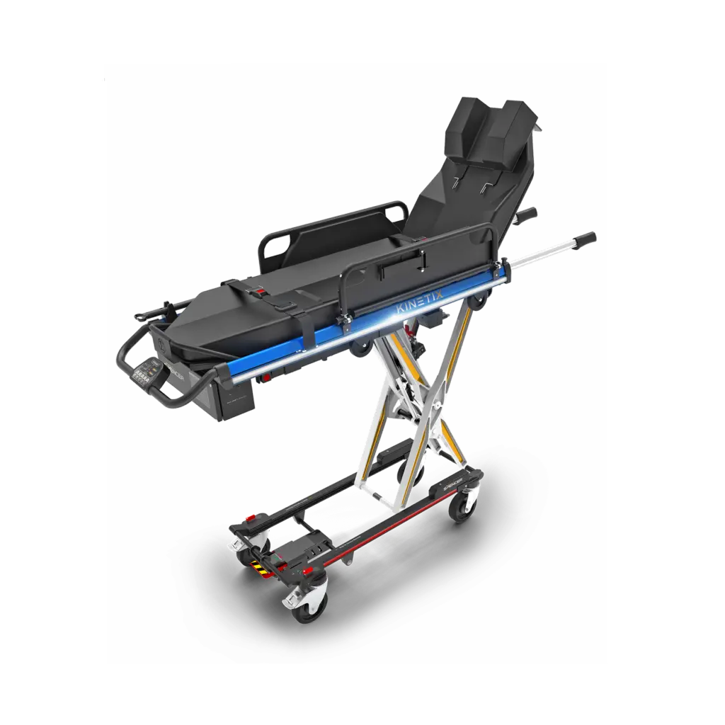 KINETIX es una camilla motorizada 10G que puede cargar hasta 300 kg en una ambulancia. No requiere ningún esfuerzo de elevación durante las operaciones de transporte y manipulación de los pacientes: con sólo pulsar un botón, el operador puede ajustar fácilmente la altura de carga deseada (hasta un máximo de 92 cm) y controlar con seguridad los movimientos de elevación y descenso del dispositivo. Las barras laterales son plegables y pueden ajustarse para aumentar la superficie de la camilla y permitir el transporte de pacientes bariátricos. El chasis acortador, las empuñaduras telescópicas y las ruedas con bloqueo direccional ofrecen una mayor maniobrabilidad en espacios reducidos, mientras que la doble batería recargable garantiza una mayor autonomía de funcionamiento. La luz LED lateral proporciona visibilidad en entornos más oscuros y de poca visibilidad