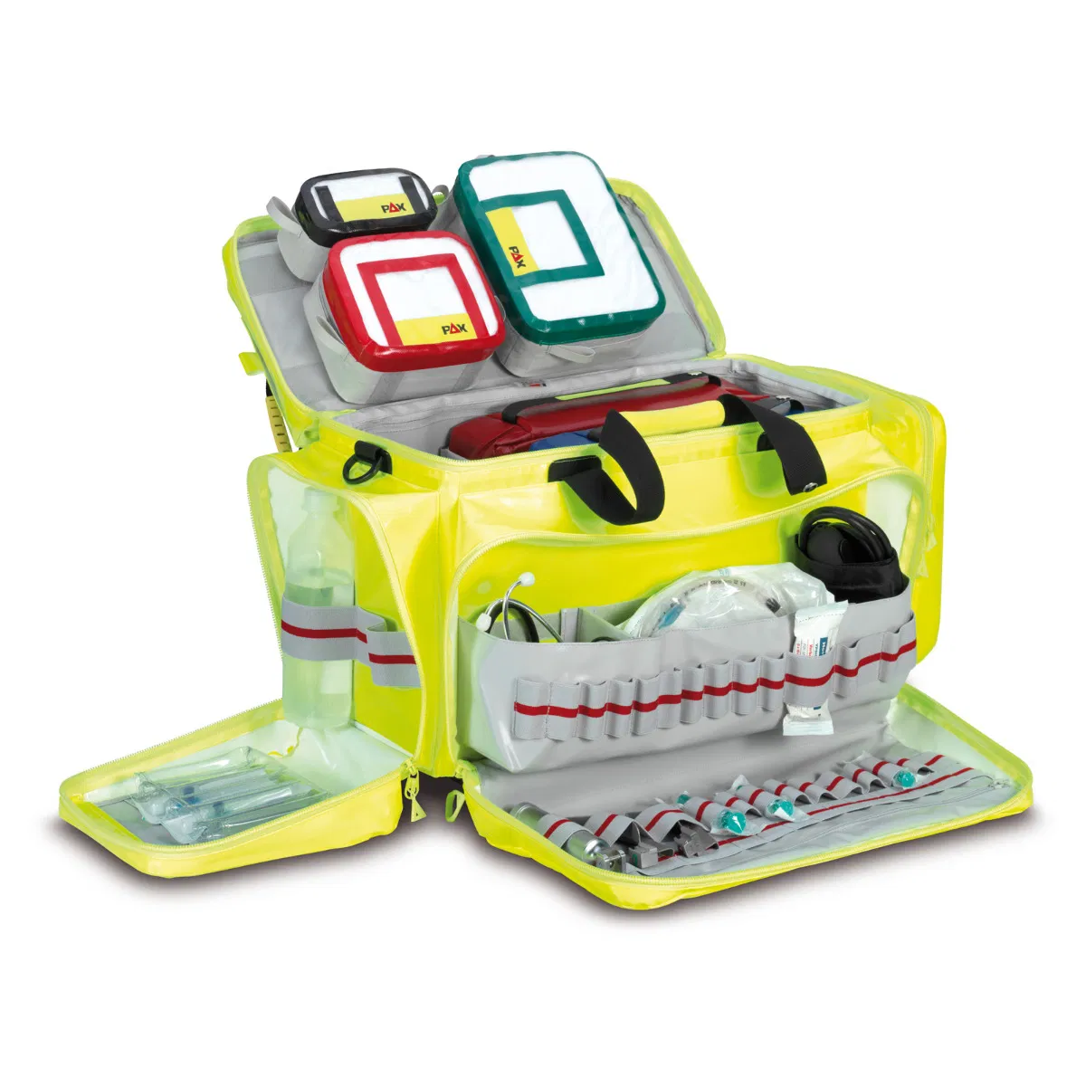 Bolsa de emergencia para uso profesional, incluye cilindro de oxígeno. Los compartimentos internos varían de tamaño; los bolsillos delantero y trasero pueden albergar los módulos de goteo intravenoso XL, intubación XL y portaampollas L y XL. El portaampollas (XS y S) cabe en el bolsillo lateral. Bolsillo superior de acceso rápido con cremallera bidireccional. Como alternativa, se puede utilizar el asa y el separador de la bolsa grande.